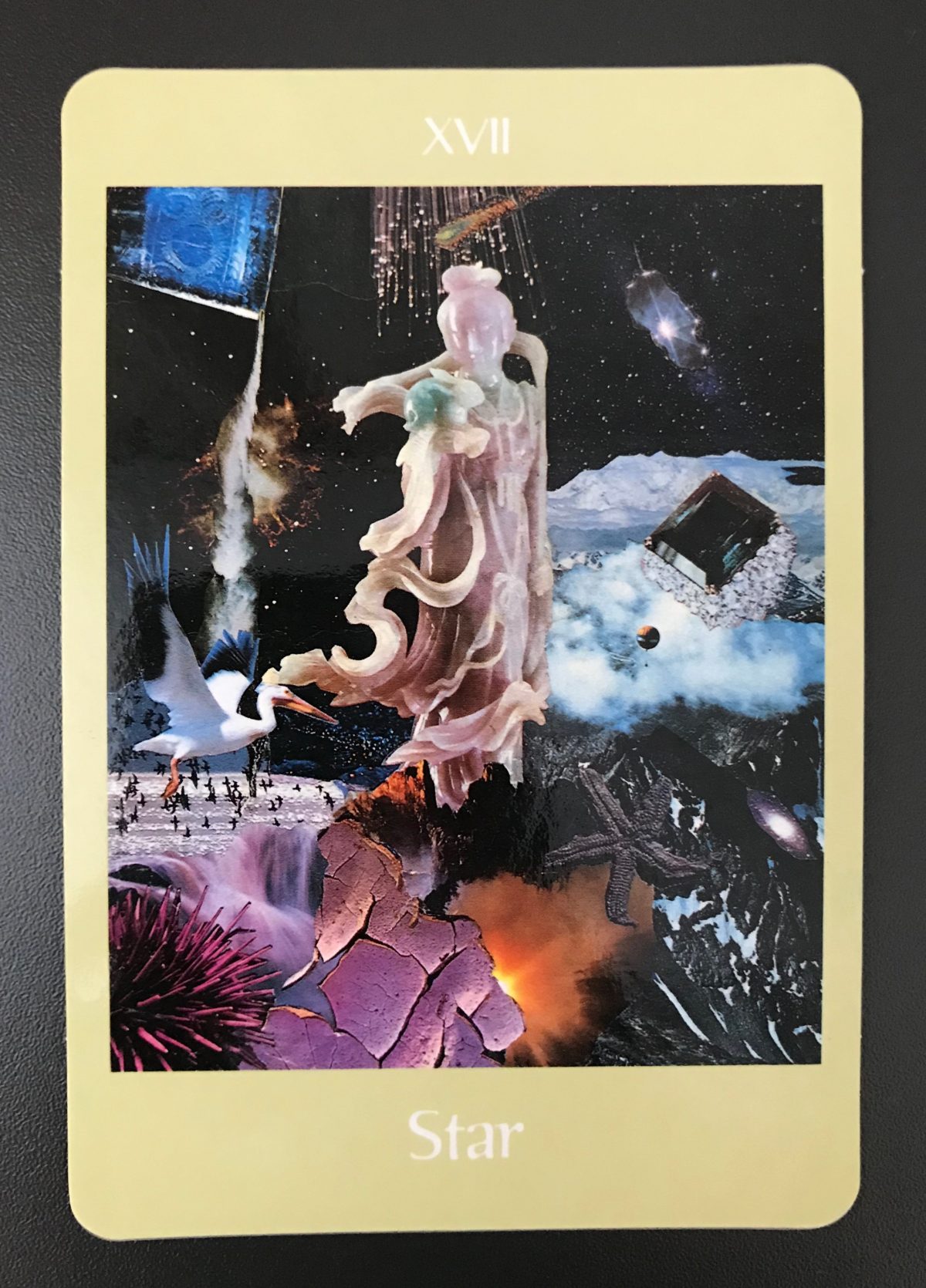 スターというカードの真ん中にいるのは観音様です。観音とは音を見る人。宇宙の声を聴き、地上へと伝えます。インスピレーションを研ぎ澄まし、あなた自身の声を信じてください。ただそのままのあなたでいることができるようになると、その輝きを求めて人が集います。あなたの考えを世界に与えていきましょう。公平で博愛的なあなたの思考が、新しい価値観を生み出します。しっかりとグラウンディングして、地上の灯台となりましょう。まずは自尊心を鍛えていきましょう。